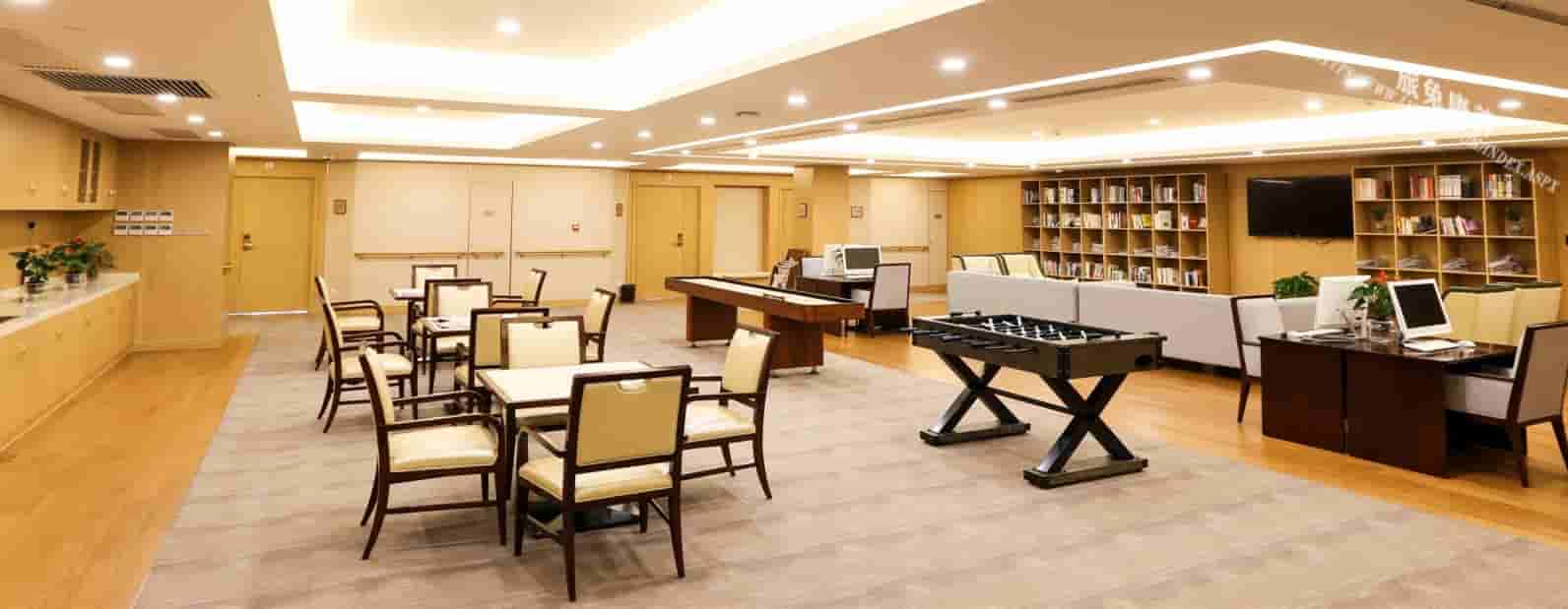 项目约50%的面积为公共服务配套设施,包括餐厅、咖啡吧、便利店等生活设施,并设有阅览室、书画室、手工室等文化设施,以及KTV、影厅、网吧、舞蹈室、棋牌室、台球厅等娱乐设施,确保长者足不出户即可享受多姿多彩的幸福生活。项目还设有医疗诊室、体检区、康复训练空间、健身房等康体设施,全力护航长者的身心健康。